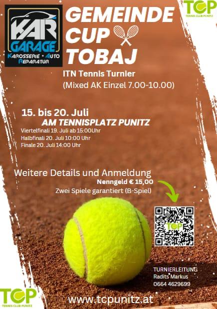 Wie man dem Flyer entnehmen kann, findet von 15. - 20. Juli unser "KAR GARAGE Gemeinde Cup Tobaj" statt. Das Turnier ist als Mixed ITN Turnier organisiert - d.h. es dürfen grundsätzlich alle, unabhängig von Alterklasse, Geschlecht, oder Wohnort mitspielen. D.h. auch auswärtige Spieler (innerhalb Österreichs) können mitspielen (deshalb darf die Einladung gerne auch geteilt werden). Vorraussetzung für die Anmeldung sind ein ITN zwischen 7 - 10 (Spielstärke) und ein BTV Konto. Falls ihr bei der Anmeldung, bei der Erstellung des BTV-Kontos oder bei einer eventuell notwendigen ITN Ersteinstufung Unterstützung braucht, meldet euch. Bei den Anmeldungen gilt: first come, first serve.